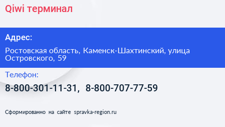 Qiwi, терминал по адресу Ростовская область, Каменск-Шахтинский, улица Островского, 59 в дальнейшем Организация, размещена в следующих категориях: