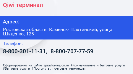 Qiwi, терминал по адресу Ростовская область, Каменск-Шахтинский, улица Щаденко, 125 в дальнейшем Организация, размещена в следующих категориях: