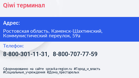 Qiwi, терминал по адресу Ростовская область, Каменск-Шахтинский, Коммунистический переулок, 59а в дальнейшем Организация, размещена в следующих категориях: