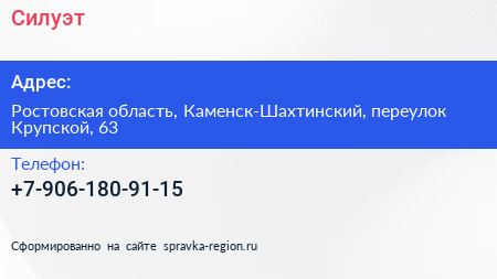 Силуэт по адресу Ростовская область, Каменск-Шахтинский, переулок Крупской, 63 в дальнейшем Организация, размещена в следующих категориях: