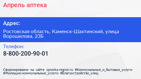 Апрель, аптека по адресу Ростовская область, Каменск-Шахтинский, улица Ворошилова, 23Б в дальнейшем Организация, размещена в следующих категориях: