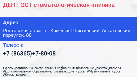 ДЕНТ-ЭСТ, стоматологическая клиника по адресу Ростовская область, Каменск-Шахтинский, Астаховский переулок, 88 в дальнейшем Организация, размещена в следующих категориях: