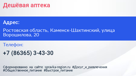 Дешёвая аптека по адресу Ростовская область, Каменск-Шахтинский, улица Ворошилова, 20 в дальнейшем Организация, размещена в следующих категориях: