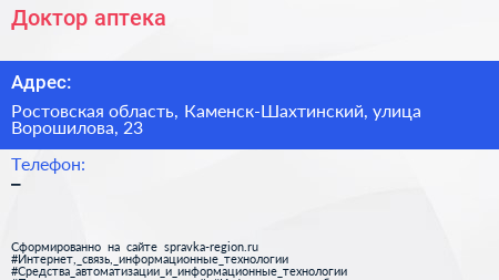 Доктор, аптека по адресу Ростовская область, Каменск-Шахтинский, улица Ворошилова, 23 в дальнейшем Организация, размещена в следующих категориях: