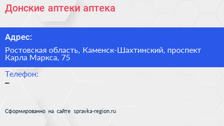 Донские аптеки, аптека по адресу Ростовская область, Каменск-Шахтинский, проспект Карла Маркса, 75 в дальнейшем Организация, размещена в следующих категориях: