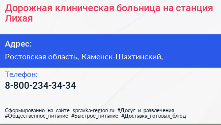 Дорожная клиническая больница на станция Лихая по адресу Ростовская область, Каменск-Шахтинский, в дальнейшем Организация, размещена в следующих категориях: