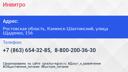 Инвитро по адресу Ростовская область, Каменск-Шахтинский, улица Щаденко, 156 в дальнейшем Организация, размещена в следующих категориях: