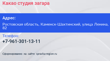 Какао, студия загара по адресу Ростовская область, Каменск-Шахтинский, улица Ленина, 82 в дальнейшем Организация, размещена в следующих категориях: