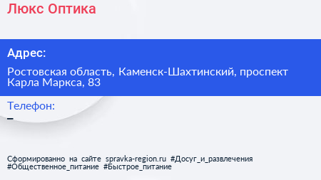 Люкс Оптика по адресу Ростовская область, Каменск-Шахтинский, проспект Карла Маркса, 83 в дальнейшем Организация, размещена в следующих категориях: