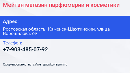 Мейтан, магазин парфюмерии и косметики по адресу Ростовская область, Каменск-Шахтинский, улица Ворошилова, 69 в дальнейшем Организация, размещена в следующих категориях: