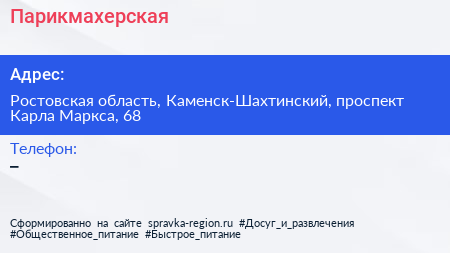 Парикмахерская по адресу Ростовская область, Каменск-Шахтинский, проспект Карла Маркса, 68 в дальнейшем Организация, размещена в следующих категориях: