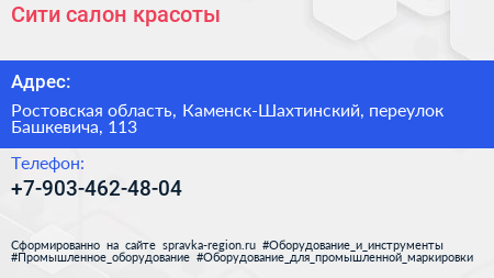 Сити, салон красоты по адресу Ростовская область, Каменск-Шахтинский, переулок Башкевича, 113 в дальнейшем Организация, размещена в следующих категориях: