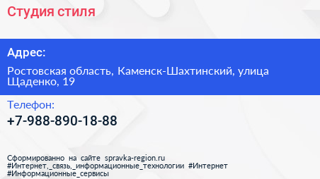 Студия стиля по адресу Ростовская область, Каменск-Шахтинский, улица Щаденко, 19 в дальнейшем Организация, размещена в следующих категориях: