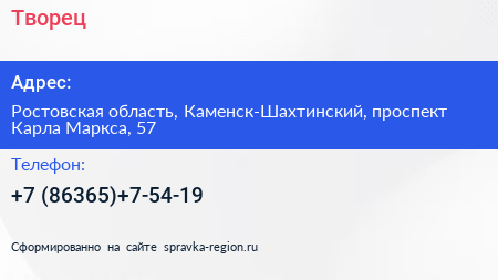 Творец по адресу Ростовская область, Каменск-Шахтинский, проспект Карла Маркса, 57 в дальнейшем Организация, размещена в следующих категориях: