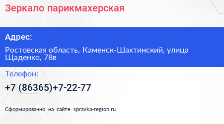 Зеркало, парикмахерская по адресу Ростовская область, Каменск-Шахтинский, улица Щаденко, 78в в дальнейшем Организация, размещена в следующих категориях: