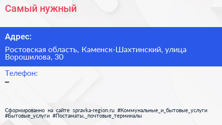 Самый нужный по адресу Ростовская область, Каменск-Шахтинский, улица Ворошилова, 30 в дальнейшем Организация, размещена в следующих категориях:
