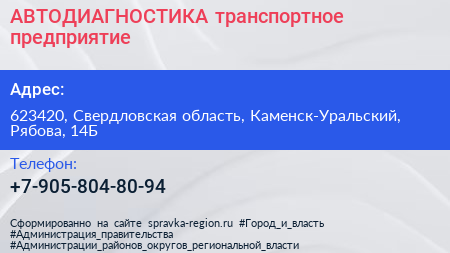 АВТОДИАГНОСТИКА, транспортное предприятие по адресу 623420, Свердловская область, Каменск-Уральский, Рябова, 14Б в дальнейшем Организация, размещена в следующих категориях: