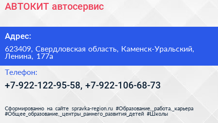 АВТОКИТ, автосервис по адресу 623409, Свердловская область, Каменск-Уральский, Ленина, 177а в дальнейшем Организация, размещена в следующих категориях: