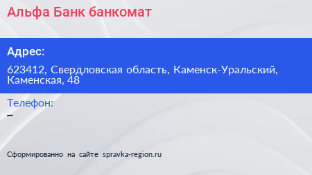 Альфа-Банк, банкомат по адресу 623412, Свердловская область, Каменск-Уральский, Каменская, 48 в дальнейшем Организация, размещена в следующих категориях:
