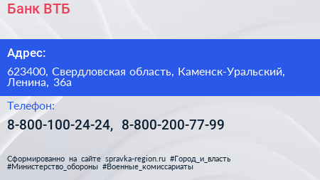 Банк ВТБ по адресу 623400, Свердловская область, Каменск-Уральский, Ленина, 36а в дальнейшем Организация, размещена в следующих категориях: