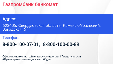 Газпромбанк, банкомат по адресу 623405, Свердловская область, Каменск-Уральский, Заводская, 5 в дальнейшем Организация, размещена в следующих категориях: