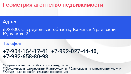 Геометрия, агентство недвижимости по адресу 623400, Свердловская область, Каменск-Уральский, Кунавина, 2 в дальнейшем Организация, размещена в следующих категориях: