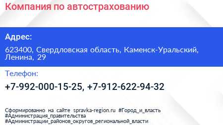 Компания по автострахованию по адресу 623400, Свердловская область, Каменск-Уральский, Ленина, 29 в дальнейшем Организация, размещена в следующих категориях: