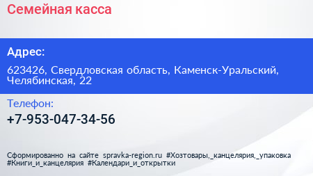 Семейная касса по адресу 623426, Свердловская область, Каменск-Уральский, Челябинская, 22 в дальнейшем Организация, размещена в следующих категориях:
