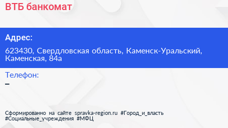 ВТБ, банкомат по адресу 623430, Свердловская область, Каменск-Уральский, Каменская, 84а в дальнейшем Организация, размещена в следующих категориях: