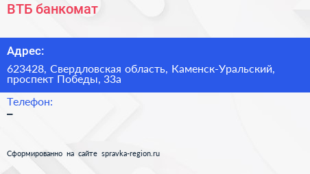 ВТБ, банкомат по адресу 623428, Свердловская область, Каменск-Уральский, проспект Победы, 33а в дальнейшем Организация, размещена в следующих категориях: