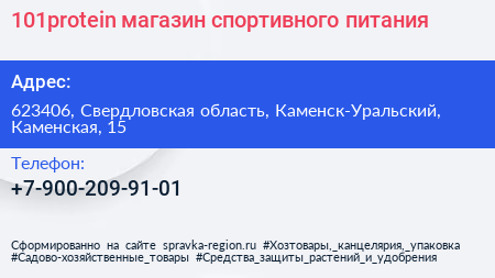 101protein, магазин спортивного питания по адресу 623406, Свердловская область, Каменск-Уральский, Каменская, 15 в дальнейшем Организация, размещена в следующих категориях: