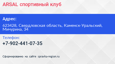 ARSAL, спортивный клуб по адресу 623428, Свердловская область, Каменск-Уральский, Мичурина, 34 в дальнейшем Организация, размещена в следующих категориях: