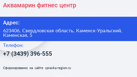 Аквамарин, фитнес-центр по адресу 623406, Свердловская область, Каменск-Уральский, Каменская, 5 в дальнейшем Организация, размещена в следующих категориях: