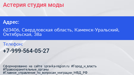 Астерия, студия моды по адресу 623406, Свердловская область, Каменск-Уральский, Октябрьская, 38а в дальнейшем Организация, размещена в следующих категориях: