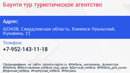 Баунти тур, туристическое агентство по адресу 623428, Свердловская область, Каменск-Уральский, Кунавина, 11 в дальнейшем Организация, размещена в следующих категориях: