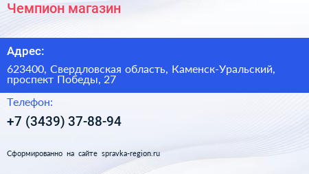 Чемпион, магазин по адресу 623400, Свердловская область, Каменск-Уральский, проспект Победы, 27 в дальнейшем Организация, размещена в следующих категориях: