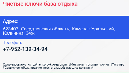 Чистые ключи, база отдыха по адресу 623403, Свердловская область, Каменск-Уральский, Калинина, 34ж в дальнейшем Организация, размещена в следующих категориях: