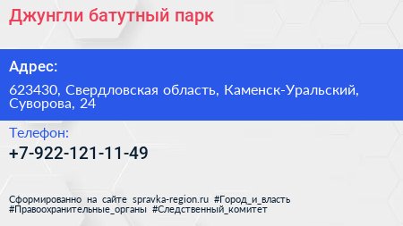 Джунгли, батутный парк по адресу 623430, Свердловская область, Каменск-Уральский, Суворова, 24 в дальнейшем Организация, размещена в следующих категориях:
