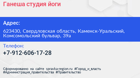 Ганеша, студия йоги по адресу 623430, Свердловская область, Каменск-Уральский, Комсомольский бульвар, 39а в дальнейшем Организация, размещена в следующих категориях: