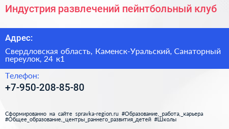 Индустрия развлечений, пейнтбольный клуб по адресу Свердловская область, Каменск-Уральский, Санаторный переулок, 24 к1 в дальнейшем Организация, размещена в следующих категориях: