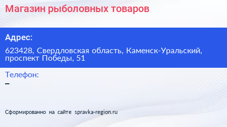 Магазин рыболовных товаров по адресу 623428, Свердловская область, Каменск-Уральский, проспект Победы, 51 в дальнейшем Организация, размещена в следующих категориях: