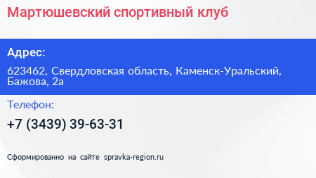 Мартюшевский спортивный клуб по адресу 623462, Свердловская область, Каменск-Уральский, Бажова, 2а в дальнейшем Организация, размещена в следующих категориях: