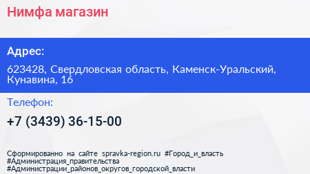 Нимфа, магазин по адресу 623428, Свердловская область, Каменск-Уральский, Кунавина, 16 в дальнейшем Организация, размещена в следующих категориях: