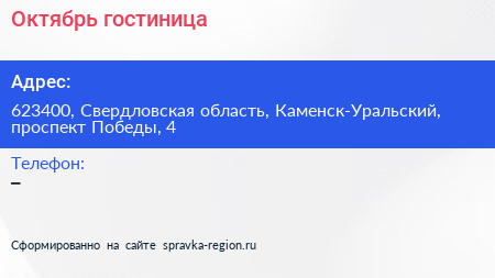 Октябрь, гостиница по адресу 623400, Свердловская область, Каменск-Уральский, проспект Победы, 4 в дальнейшем Организация, размещена в следующих категориях: