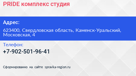 PRIDE, комплекс-студия по адресу 623400, Свердловская область, Каменск-Уральский, Московская, 4 в дальнейшем Организация, размещена в следующих категориях: