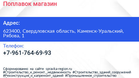 Поплавок, магазин по адресу 623400, Свердловская область, Каменск-Уральский, Рябова, 1 в дальнейшем Организация, размещена в следующих категориях: