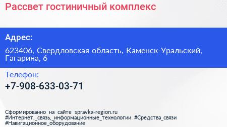 Рассвет, гостиничный комплекс по адресу 623406, Свердловская область, Каменск-Уральский, Гагарина, 6 в дальнейшем Организация, размещена в следующих категориях: