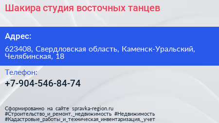 Шакира, студия восточных танцев по адресу 623408, Свердловская область, Каменск-Уральский, Челябинская, 18 в дальнейшем Организация, размещена в следующих категориях: