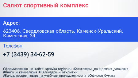 Салют, спортивный комплекс по адресу 623406, Свердловская область, Каменск-Уральский, Каменская, 34 в дальнейшем Организация, размещена в следующих категориях: