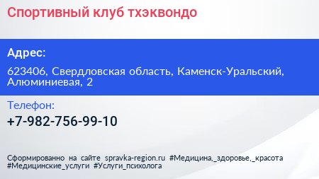 Спортивный клуб тхэквондо по адресу 623406, Свердловская область, Каменск-Уральский, Алюминиевая, 2 в дальнейшем Организация, размещена в следующих категориях: